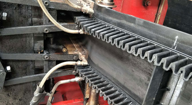 擋邊和隔板的底部和基帶熱硫化成一體,擋邊和隔板的高度可以達(dá)到40-630mm,在擋邊中加貼帆布以加強(qiáng)擋邊抗撕裂強(qiáng)度,波狀擋邊帶柔順靈活,能保證輸送帶平穩(wěn)的通過端輪和尾輪。