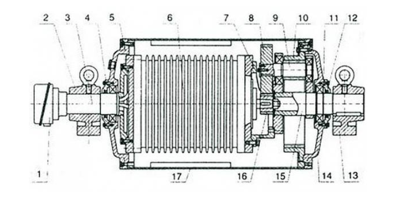 電動(dòng)滾筒的構(gòu)造圖它主要由支座、滾筒體、驅(qū)動(dòng)電機(jī)、左右法蘭軸、齒輪、齠輪和內(nèi)齒圈等構(gòu)成。左右法蘭軸及驅(qū)動(dòng)電機(jī)外殼連結(jié)成連續(xù)的抗彎梁,接受膠帶的拉力,電動(dòng)機(jī)經(jīng)兩級(jí)齒輪減速后,帶動(dòng)滾筒體旋轉(zhuǎn),在滾筒轉(zhuǎn)動(dòng)時(shí),焊接在滾筒內(nèi)壁上的刮油板帶起注入滾筒內(nèi)的機(jī)油,從而完成對(duì)電機(jī)、齒輪、軸承等零部件的冷卻和光滑。