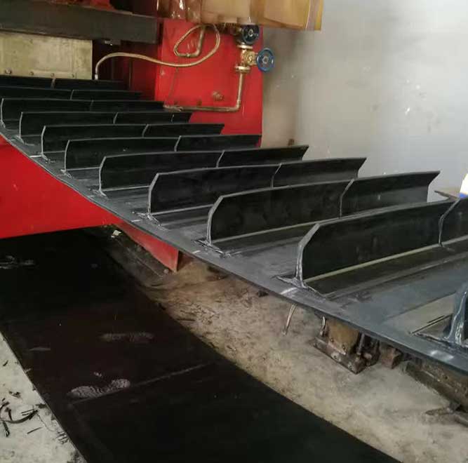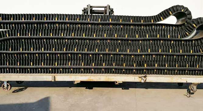 更換輸送帶,可將新帶與舊帶連在一起,卸帶與安裝新輸送帶同時進(jìn)行對于水平運(yùn)轉(zhuǎn)的輸送機(jī),可在任何一點(diǎn)切斷舊輸送機(jī),傾斜方向運(yùn)轉(zhuǎn)的輸送機(jī),則需選好切斷點(diǎn),防止因自重引起下滑失控。在輸送機(jī)上將新帶的位置放正后,用夾具將膠帶的一端固定好,然后與繞過輥與帶輪的繩索相連,通過牽引裝置將輸送帶平衡的架到輸送機(jī)上,牽引時,要防止輸送帶與機(jī)架相互擠壓。