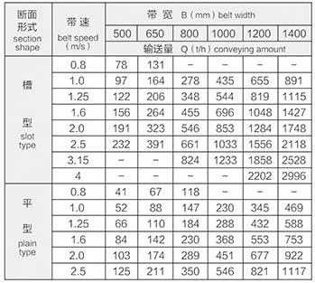 輸送量:參看表(一)(物料容量R=1.0噸/米,輸送機(jī)傾斜角B≤60、物料堆積角=300)